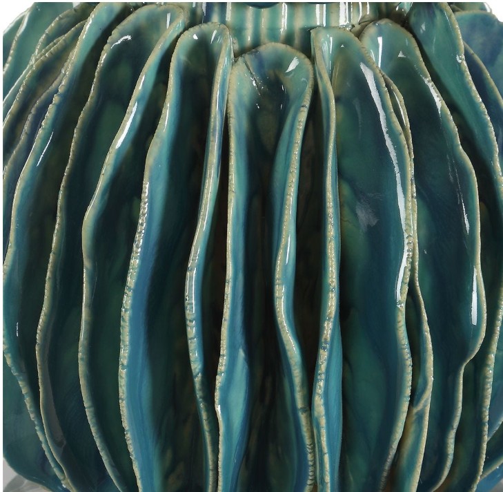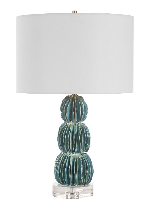 The Aruba lamp showcases a captivating ceramic base of stacked spheres, each adorned with carefully folded and layered ceramic disks. Each piece is a unique handcrafted marvel, finished in a distressed mottled teal blue glaze. The textural interplay is further enhanced by a thick crystal foot and brass plated details. The round hardback shade is covered in a crisp white linen. Due to the nature of fired glazes on ceramic lamps, finishes will vary slightly.
