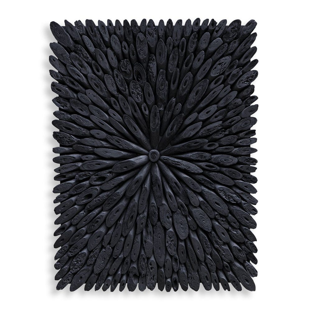 This wood wall panel is handcrafted from individually cut natural driftwood pieces in a white washed finish, artfully arranged in a striking sunburst pattern. May be hung horizontal or vertical. Also available to special order in black.