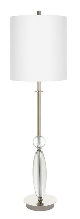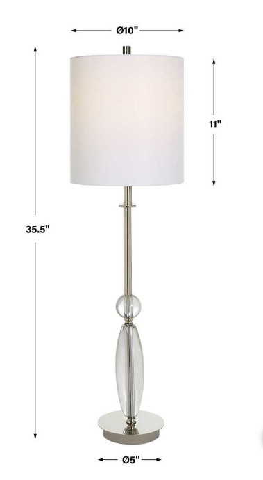 This buffet lamp features elegant curves with thick crystal ornaments paired with plated polished nickel details. A round hardback white linen fabric shade completes the look.