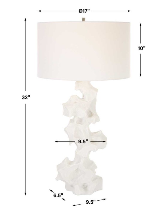 Crafted from man-made white stone that accurately replicate the look of Thassos marble, the Sculptured Stone Lamp doubles as lighting and a modern work of art that’s accented with brushed nickel plated details. The hardback drum shade is covered in white linen fabric.